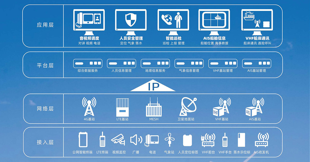 VHF船岸通訊 AIS船舶位置 智能語音播報 氣象信息 | 風場內(nèi)部通訊 數(shù)字調度系統(tǒng) 數(shù)字錄音系統(tǒng) 網(wǎng)絡管理系統(tǒng) | 高速寬帶數(shù)傳 應急寬帶鏈路 視頻數(shù)據(jù)傳輸 多媒體業(yè)務調度 |